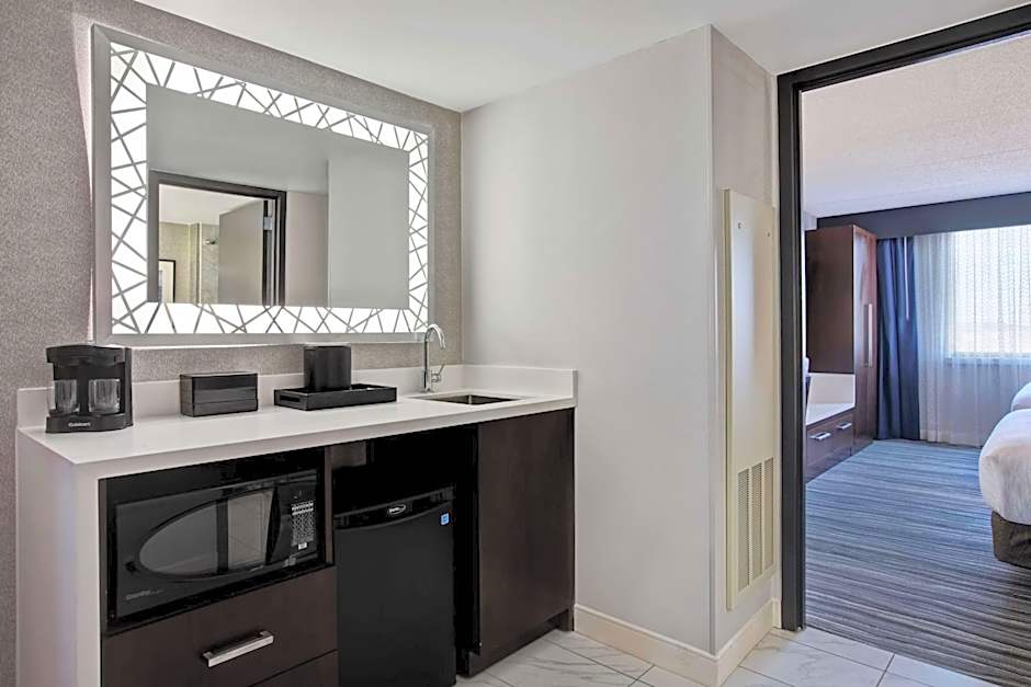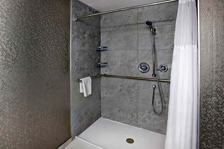 This mobility accessible standard suite features one king-sized bed, and an accessible tub. Any corresponding photo may not reflect the specific accessible room type or room feature.